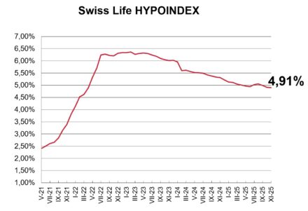Pouze o tři desetiny procentního bodu letos klesly podle Swiss Life Hypoindexu úrokové sazby u hypotečních úvěrů. V minulém roce to bylo o osm desetin. Poslední měsíc letošního roku nabídkové sazby hypoték stagnovaly. Index Swiss Life Hypoindex za rok 2025 uzavírá na hodnotě 4,91 %. Poslední čtvrtletí se sazby nepohnuly ani jedním směrem a zamrzly na hodnotě těsně pod pěti procenty.