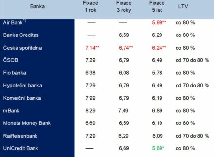 Nejdražší zůstává mBank, která má stále jako jediná banka na trhu v nabídce jednoleté fixace za hranicí osmi procent (8,29 % p. a.), tříleté fixace téměř za 7,5 % p.a. a pětileté za 6,89 % p. a.