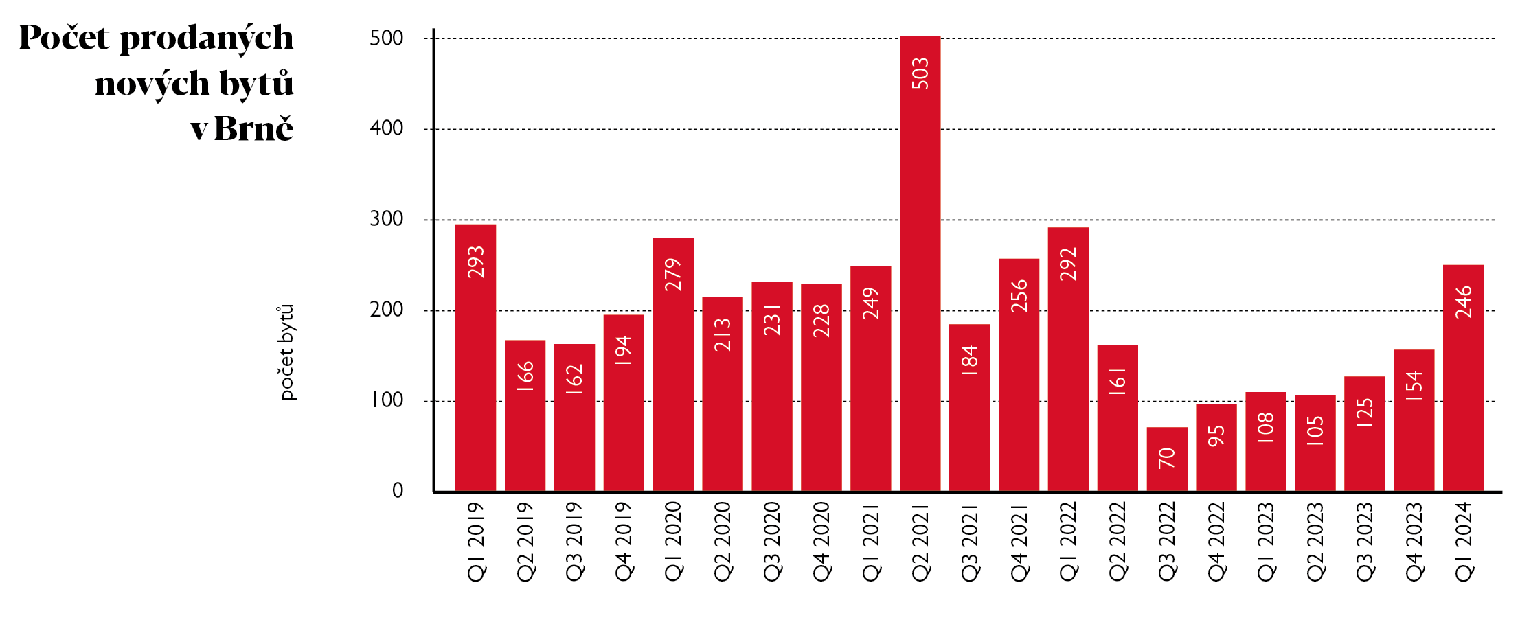 Prodeje za letošní první tři měsíce s přehledem překonaly očekávání řady realitních expertů. Zatímco desetiletá statistika udává, že se v Brně průměrně každé čtvrtletí prodá asi 220 novostaveb, posledních pět let tento trend překreslilo o zhruba 10 % dolů a až do konce loňského roku se prodávalo asi 200 nových bytů za kvartál. Přitom více bytů než v letošním prvním čtvrtletí se v moravské metropoli naposledy prodalo těsně předtím, než trhem zamávaly ekonomické dopady ruské invaze na Ukrajinu, tedy v prvních třech měsících roku 2022.