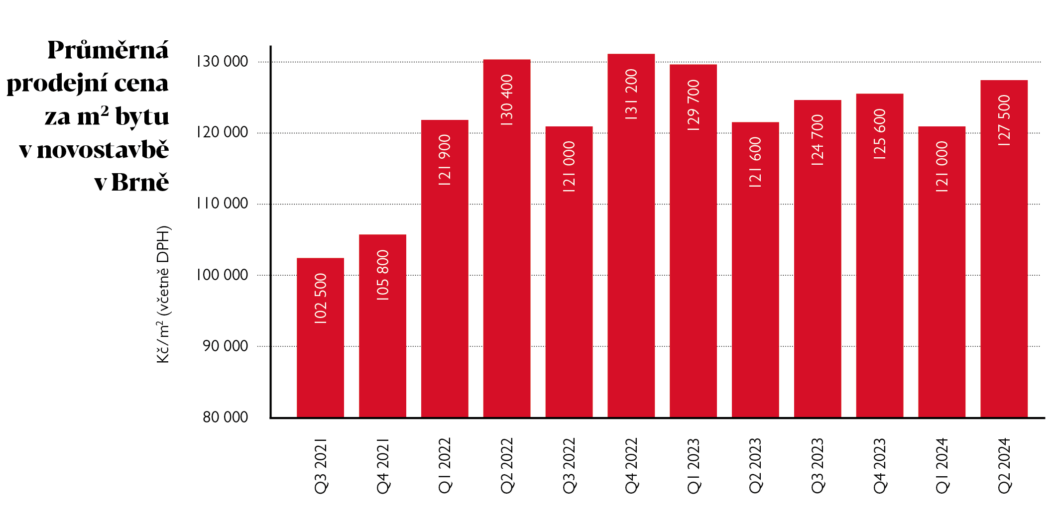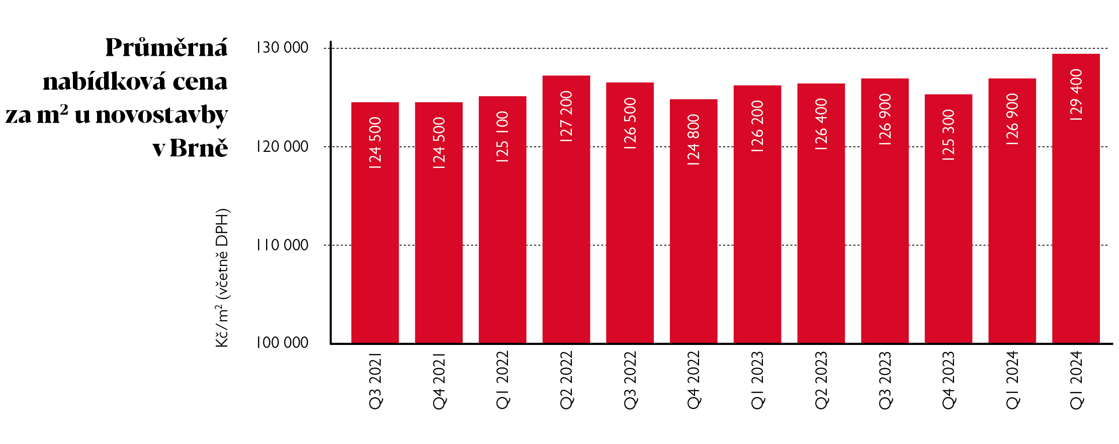 Rostoucí prodeje vytvářejí tlak také na nabídkovou cenu. V letošním druhém čtvrtletí se metr čtvereční v Brně dostal v průměru na 129 400 Kč, což je o zhruba čtyři tisíce více než v posledním loňském čtvrtletí. Hodnota odpovídá průměru za celé tři měsíce, ve skutečnosti byl nárůst cen ještě o něco větší – v červnu se totiž průměrná cena volných bytů vyšplhala z květnových 129 000 Kč až na 131 700 Kč za metr čtvereční.
