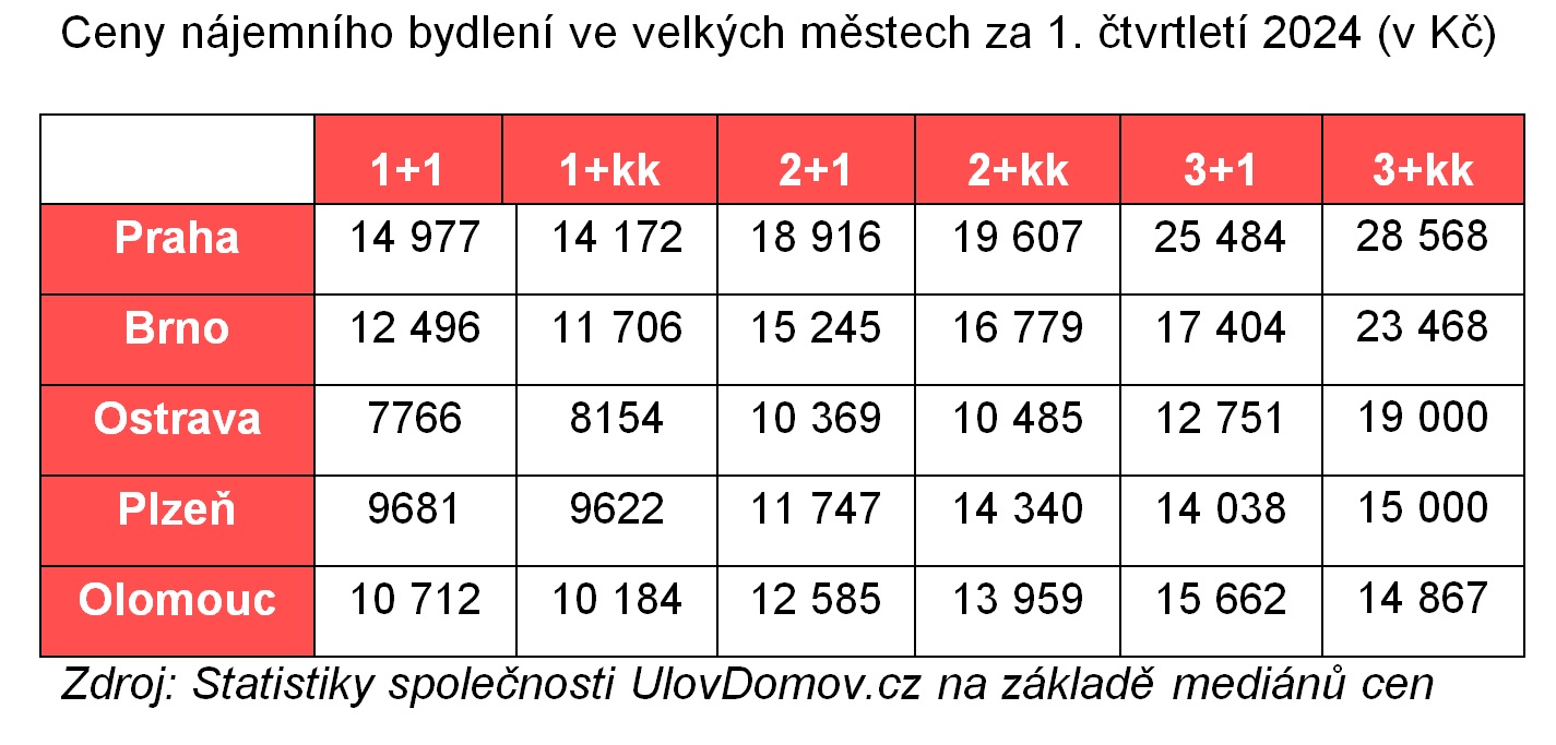 V Praze vzrostly ceny pronájmů meziročně o 1 až 4 procenta, tedy o 120 až 540 korun. Mírný růstový trend ukázala i další krajská města, například Ostrava až o 12 procent u dispozice 1+kk (850 Kč) či Olomouc o 14 procent u dispozice 1+1 (1330 Kč). Ceny nájmů v Brně rovněž meziročně rostly v jednotkách procent. Aktuálně si lze v Brně pronajmout byt dispozice 1+kk za cenu kolem 11 700 korun, byt dispozice 2+kk za cenu kolem 16 800 korun a byt dispozice 3+kk za cenu kolem 23 500 korun. Na vzorku zkoumaných bytů u některých dispozic cena i mírně klesala, což UlovDomov.cz vysvětluje jako souhru faktorů, které ovlivňují cenu.