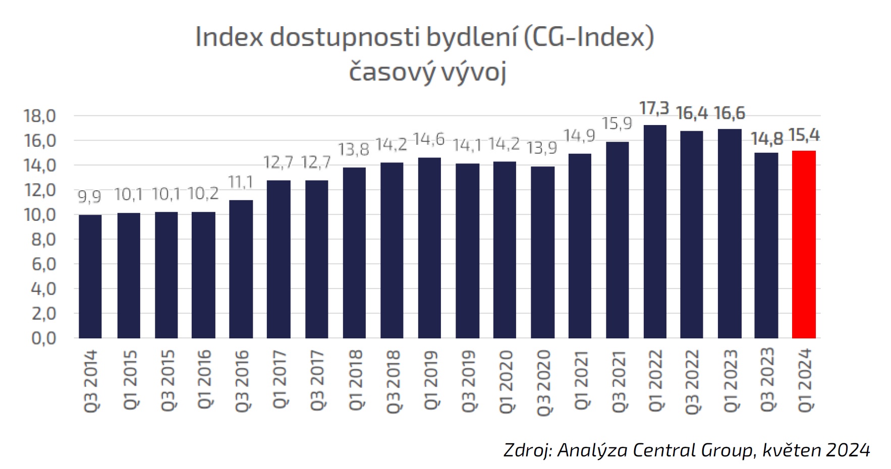 Podle dnes zveřejněného indexu dostupnosti bydlení (CG-Index) se dostupnost bydlení v Praze opět zhoršila. Na průměrný nový byt o výměře 70 m2 je nyní v hlavním městě potřeba 15,4 ročních mezd (maximum bylo v prvním čtvrtletí 2022 – 17,3), což je nejvíce ze všech okolních metropolí. Praha je v regionu nejméně dostupná i co se týká nájemného.