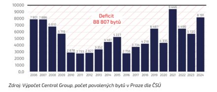 Podle aktuálních dat ČSÚ bylo loni v Praze povoleno celkem 8191 bytů, z toho 6967 v bytových domech. Meziročně jde o výrazný nárůst (+ 43 %), to je však dáno nízkou srovnávací základnou roku 2023. Podstatnější ale je, že se ani loni nepodařilo prolomit 10tisícovou hranici, udávající minimální počet bytů, které hlavní město pro svůj rozvoj každoročně potřebuje. Mimochodem toto číslo od roku 2006 nebylo pokořeno ani jednou a jen za tuto dobu bytový deficit Prahy narostl téměř o 90 tisíc bytů.