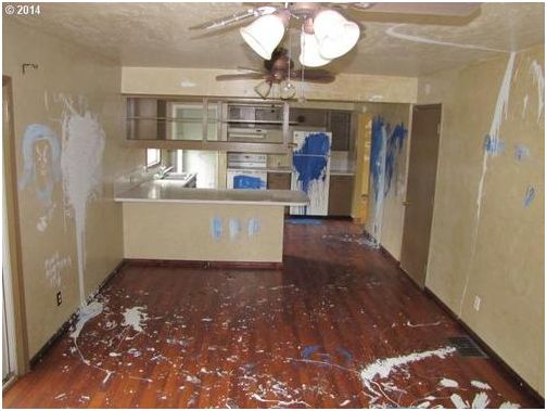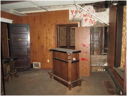 Nápis “Zemřeš” přímo podněcuje ke koupi tohoto domu, díra ve stropě už jen decentně dodává na “útulnosti” potencionálního domova.