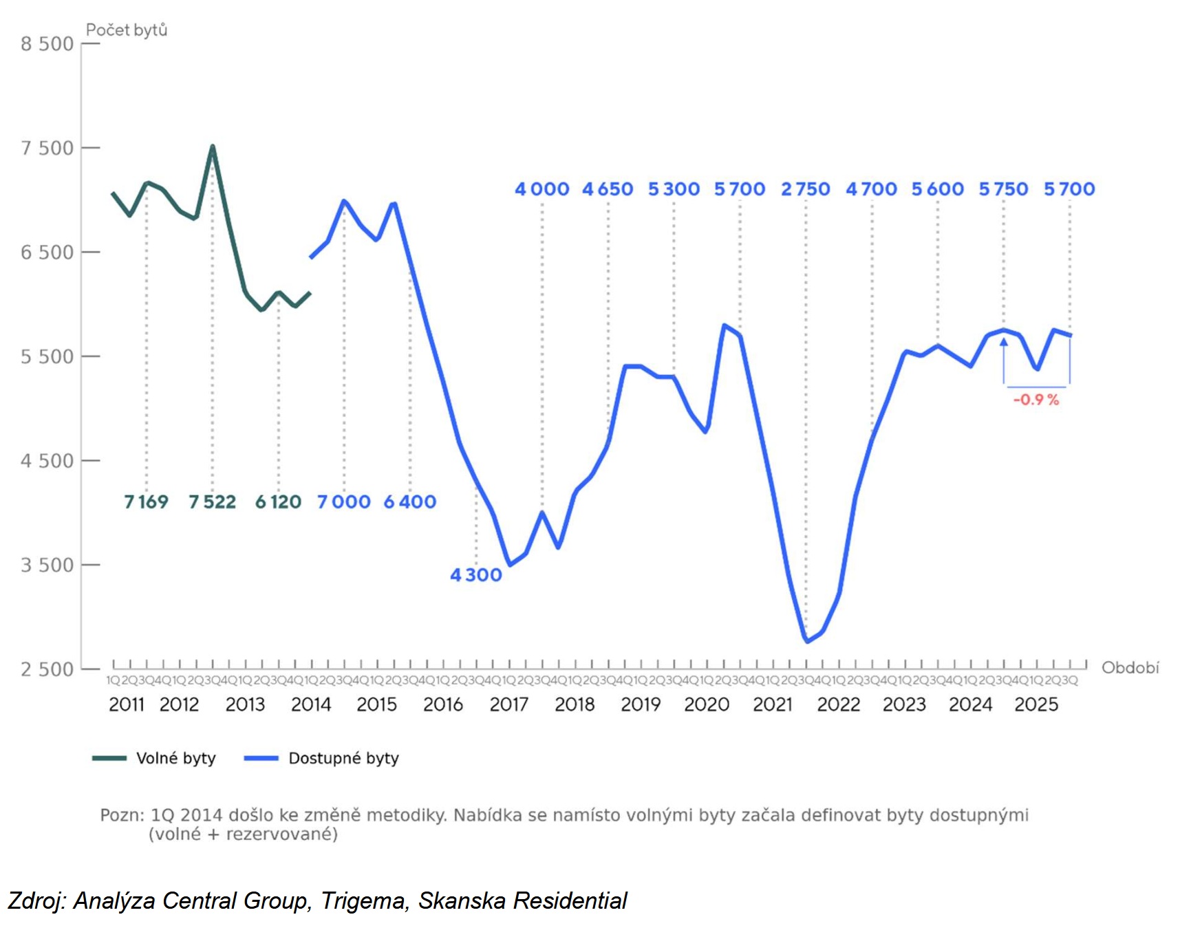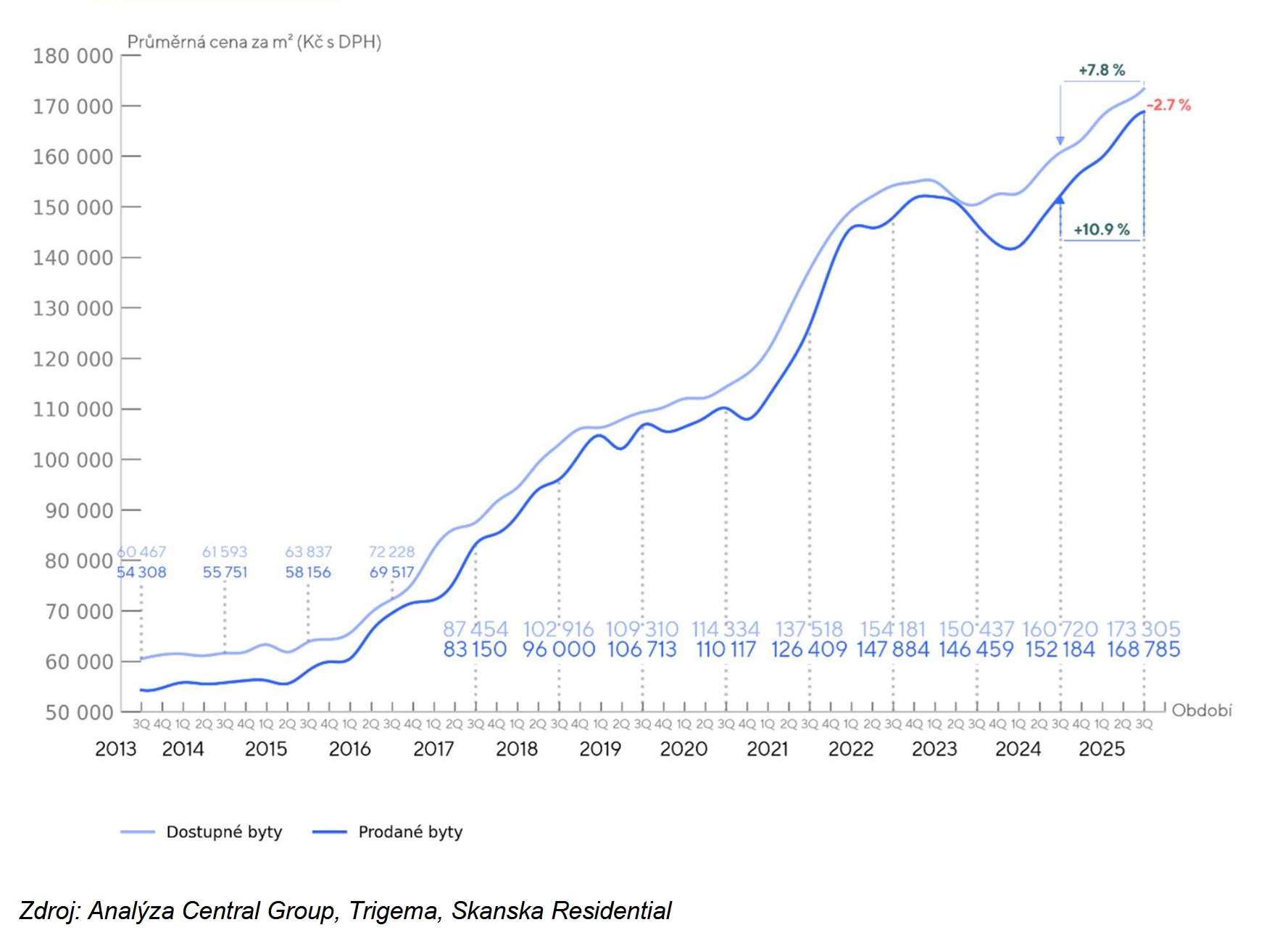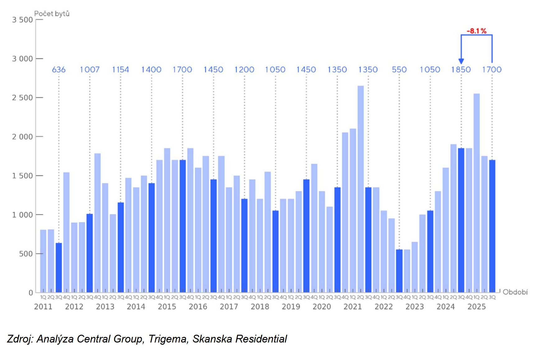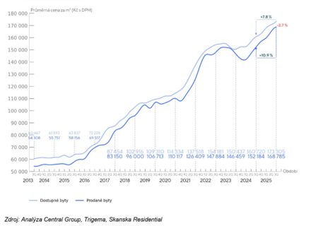 Nejnovější data z rezidenčního trhu potvrzují pokračující silný zájem o nové byty v Praze. Za první tři letošní čtvrtletí se prodalo 6000 nových bytů, meziročně o 12 % více. Celkové letošní prodeje by tak mohly přesáhnout 7500 bytů, což by znamenalo nový pražský prodejní rekord. Naproti tomu nabídka bytů již téměř tři roky stagnuje a zůstává nedostatečná, což se projevilo dalším růstem cen. Vyplývá to z tržní analýzy developerských společností Central Group, Skanska a Trigema.
