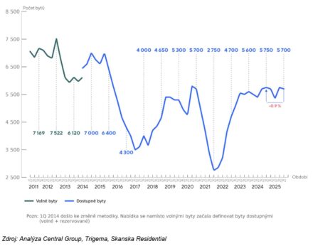 Koncem září bylo v Praze v nabídce 5 700 nových bytů, což je téměř stejně jako před rokem (meziročně pokles o 50 bytů). Nejvyšší nabídka zůstává na Praze 9, která tvoří zhruba čtvrtinu trhu. Následují Praha 5 a 10, každá se zhruba 20 % podílem na počtu volných jednotek.
