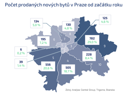 Nejvíce bytů se letos zatím prodalo v Praze 9, na tento městský obvod připadá téměř 30 % ze všech prodaných bytů, a to zejména díky cenám, které jsou nejnižší v metropoli. Například projekty Central Group, Tesla Hloubětín a Harfa Living, se aktuálně prodávají za 130, respektive 115 tisíc Kč/m², zatímco průměr trhu činí 150.437 Kč/m². I proto oba tyto projekty patří mezi nejprodávanější v celé metropoli.