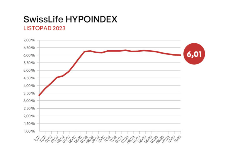 Průměrná nabídková sazba hypotečních úvěrů podle Swiss Life Hypoindexu se za poslední měsíc snížila o další čtyři bazické body a k 6. listopadu činila 6,01 % p. a. Za posledního půl roku klesly sazby o 31 bazických bodů, v průměru tedy zhruba o pět bazických bodů za měsíc.