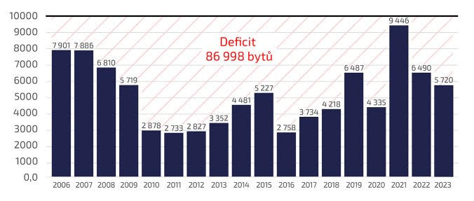 Problémem ale je, že se tyto byty kvůli nefunkčnímu systému povolování nových staveb nedaří v dostatečném počtu dostat na trh. Dlouhodobě se jich totiž povoluje jen kolem 5 tisíc ročně, přitom každoroční potřeba hlavního města je minimálně dvojnásobná. V Praze proto prudce narůstá bytový deficit. Jen od roku 2006, od kterého Český statistický úřad publikuje data povolených bytů za Prahu, narostl pražský bytový deficit o více než 85 tisíc bytů.
