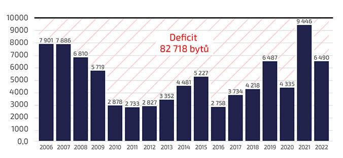 Od roku 2006, od kterého Český statistický úřad publikuje data povolených bytů za Prahu, se potřebných 10 tisíc bytů za rok v Praze nepovolilo ani jednou. Dlouhodobý průměr je navíc jen zhruba 5 tisíc povolených bytů ročně. Jen za zmiňované období tedy bytový deficit Prahy vzrostl o více než 80 tisíc bytů.