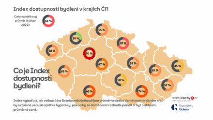 Index dostupnosti bydlení (IDB) v květnu vystoupal z dubnových 66,6 na 68,4 %. Jedná se však o číslo za celou Českou republiku. Z pohledu jednotlivých krajů nejlepší míra dostupnosti bydlení (měřeno indexem IDB) je v Ústeckém kraji, kde index aktuálně dosahuje 30,2 %. Naopak nejhorší situace je nepřekvapivě v Praze, kde IDB vystoupal v květnu na rovných 91 procent a to index zohledňuje i vyšší příjmy pražských domácností.