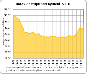 A stagnace cen se pozitivně projevuje také v dosažitelnosti bydlení. Její prudké zhoršování alespoň prozatím skončilo a index dostupnosti bydlení, který vyjadřuje, jak velkou část příjmu vynakládá česká domácnost za splátku hypotéky, se stabilizovala pod 40% procentní hranicí. Jak dlouho tu setrvá?