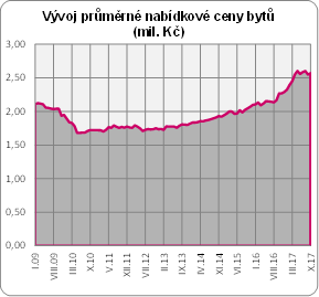 Průměrná nabídková cena bytů v říjnu dosáhla 2,57 mil. Kč, což je sice o zhruba 20 000 více než v předchozím měsíci a o 300 000 více než loni touto dobou. Přesto je patrné, že se na realitním trhu něco děje. Zatímco v loňském roce ceny rostly měsíc co měsíc o desítky tisíc korun a tento boom vyvrcholil v letošním květnu, kdy ceny úspěšně atakovaly hranici 2,6 mil. Kč. Nyní je na trhu zřetelné ochlazení. Ceny od letošního dubna fakticky oscilují mezi 2,55 a 2,6 mil. Kč.