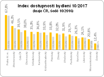 Na regionální úrovni je situace ve většině krajů o něco lepší, než je celorepublikový průměr, protože ten je z velké části tažen nahoru Brnem a především Prahou, kde hodnota IDB dosahuje téměř 68 %. Mediánově dle krajů nyní hodnota indexu dostupnosti bydlení vychází na zhruba 33 %. Nicméně i na úrovni regionů je v meziročním srovnání vidět znatelné zhoršení. Zatímco loni byl index dostupnosti bydlení v 11 z 14 krajů pod 30 procenty. Nyní je to jen 5 krajů – Pardubický, Vysočina, Liberecký, Moravskoslezský a Ústecký.