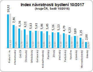 Podobně jako v případě indexu dostupnosti bydlení je celorepublikový průměr do jisté míry zkreslen statistikami z Prahy a Brna. Mediánový index návratnosti bydlení se pohybuje okolo 5násobku čistých příjmů. Aktuální hodnoty indexů a jejich posun oproti loňsku ilustrují následující grafy. Loňské říjnové hodnoty INB jsou v grafech vyneseny šedě.