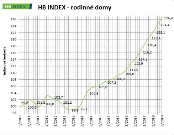 - Ceny rodinných domů se během třetího čtvrtletí zvyšovaly pomaleji, a to o 1,6 pcb na novou rekordní hodnotu HB INDEXu 126,4. Meziročně ceny stouply o 6,7 pcb.