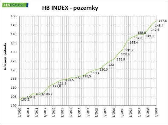 - U pozemků došlo ke zpomalení růstu, a to na 1,4 pcb na výslednou hodnotu INDEXu 147,5. Oproti třetímu čtvrtletí roku 2017 ale jejich cena vzrostla o 5,5 pcb, tedy nejméně ze sledovaných skupin.