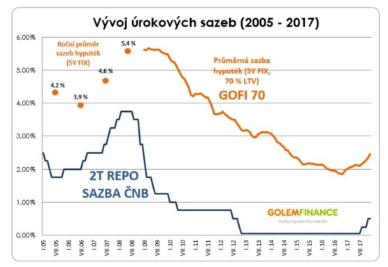 Co se tedy stane, pokud ČNB zítra zvýší sazby? Po velké vlně zdražování, která odstartovala v listopadu loňského roku a kulminovala na přelomu roku, nyní dochází na trhu k určité stabilizaci cenové hladiny hypoték. Od poloviny ledna už žádná banka se sazbami nehýbala. Nicméně cena peněz na mezibankovním trhu již několik dnů opět roste a případné navýšení sazeb ČNB by bylo dalším impulzem pro posun hypotečních sazeb směrem vzhůru,“ říká Libor Ostatek, ředitel makléřské společnosti GOLEM FINANCE, která se specializuje na poradenství v oblasti hypoték a úvěrů ze stavebního spoření. „Hypotéky pod regulovanou hranici 80 % LTV se nyní nabízejí v průměru těsně pod hranicí 2,5 procenta (měřeno INDEXY GOFI). Pokud ČNB sazby zvedne, hypotéky tuto hranici překonají,“ dodává Libor Ostatek.