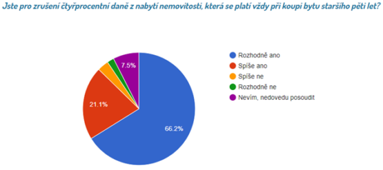 Praha, 23. září 2019 – Drtivá většina Čechů je pro úplné zrušení daně z nabytí nemovitosti, která významně zvyšuje ceny starších bytů. Ukázal to exkluzivní průzkum agentury IPSOS pro největšího rezidenčního stavitele Central Group. Čtyřprocentní daň z koupi každé nemovitosti kromě novostaveb platí od roku 2016 výhradně kupující. Senátoři ji nedávno označili doslova za nemorální, jelikož trestá lidi za snahu pořídit si vlastní bydlení. Navrhli ji proto zcela zrušit, o čemž by měli nyní na své úterní schůzi rozhodnout poslanci.