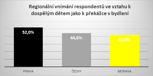 Dospělé děti jako „překážku“ vnímají méně lidé na Moravě, kde tento názor zastává jen 42 % respondentů. Naopak v Praze by s dospělými dětmi nechtěla domácnost sdílet více než polovina rodičů.