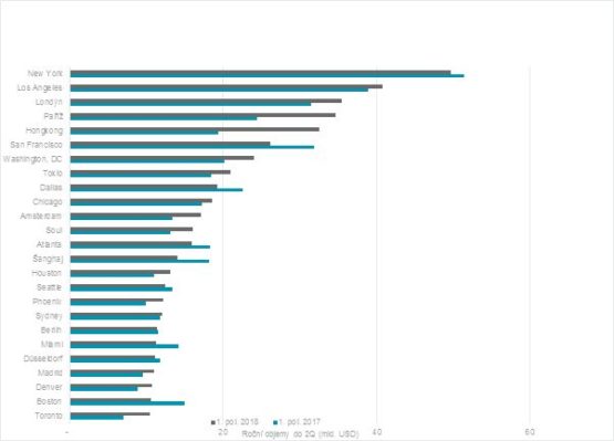 Navzdory geopolitické nejistotě a zpomalení ekonomického cyklu se investice na globálním realitním trhu meziročně zvýšily o významných 18 % a dosáhly nového rekordu 1,8 bilionu dolarů (2017: 1,5 bil. dolarů), uvádí se ve zprávě společnosti Cushman & Wakefield, která analyzuje investiční aktivitu na globálním trhu s komerčními nemovitostmi a posuzuje města podle úspěšnosti v přitahování kapitálu. Praha spadla v globálním žebříčku na 84. místo s investičním objemem 1.48 miliardy dolarů (Q2 2017 – Q2 2018).