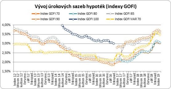 V únoru pokračovalo snižování úrokových sazeb. Pro zlevnění hypoték se rozhodla Komerční banka, Hypoteční banka, Oberbank, Raiffeisenbank, mBank, Česká spořitelna a Wuestenrot hypoteční banka. Index GOFI 70 mapující napříč trhem průměrnou nabídkovou sazbu hypotečních úvěrů s LTV do 70 % klesl v průběhu února z lednových 3,06 % na 3,02 %. O 4 bps. klesl i index GOFI 80, jehož aktuální hodnota je jen o 3 setiny procentního bodu nad průměrem 70% hypoték a má hodnotu 3,05 %.