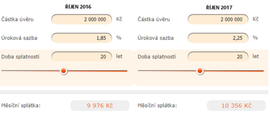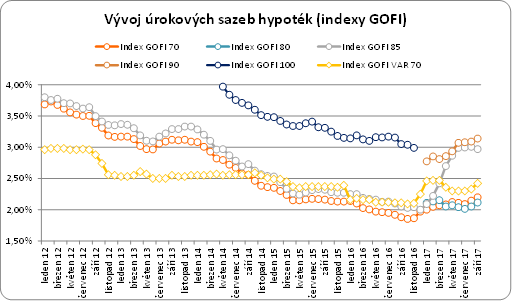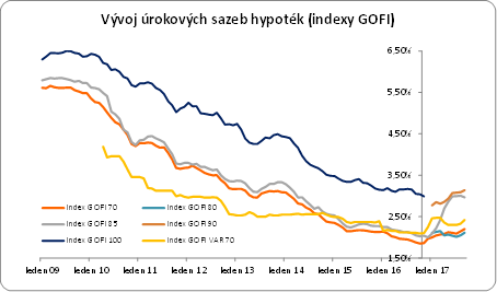 V listopadu 2016 začaly sazby hypoték růst. V lednu vlivem chystaných doporučení ČNB akceleroval růst sazeb hypoték s LTV nad 80 %, ale pozvolný růst vykazují i sazby hypoték v „neregulovaném“ pásmu do 80 % LTV. Index GOFI 70 za posledních 12 měsíců přidal 4 desetiny procentního bodu a aktuálně dosahuje 2,25 %. V korunovém vyjádření nárůst sazeb o 4 desetiny procenta znamená u 2milionové hypotéky s 20letou splatností změnu v měsíční splátce 380 Kč.