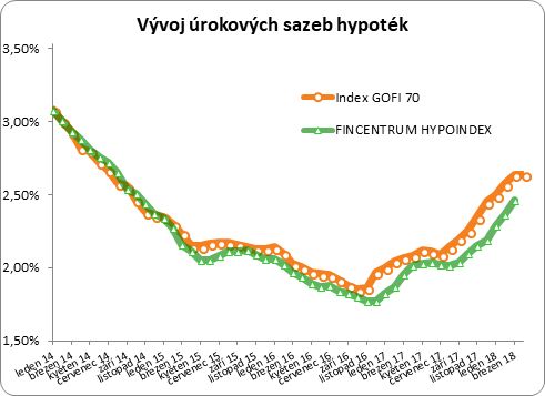 Průměrná úroková sazba sjednaných hypoték vzrostla v souladu s naším očekáváním odvozeným od vývoje nabídkových sazeb na 2,51 %. Oproti loňskému dubnu je nyní průměrná úroková sazba sjednávaných hypoték o půl procentního bodu výše. Data FINCENTRUM HYPOINDEXu vycházejí ze skutečných produkčních dat a vlivem časově prodlevy mezi žádostí a podpisem hypoteční smlouvy mají minimálně měsíční zpoždění za vývojem nabídkových sazeb, jak je monitorují indexy GOFI. Titulní GOFI 70 v dubnu již přestal růst a stagnoval na březnové hodnotě 2,64 %. Tuto stagnaci v reálných sazbách očekáváme v příštím měsíci nebo červnu.