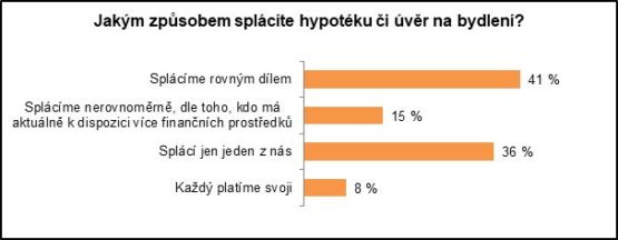 Cena nemovitostí v poměru k platům je v České republice jedna z nejvyšších v Evropě. Češi tak při koupi vlastní nemovitosti sahají k hypotékám. Jen v loňském roce jich s tímto účelem bylo sjednáno téměř 60 tisíc. Hypotéku mají partneři nejčastěji sjednanou společně a 41 % ji splácí napůl. „Tento podíl je trochu nižší na Moravě, kde spíše splácí jen jeden. Přisuzovat to můžeme tradičnějšímu rozdělení rolí v domácnosti,“ uvedl Marian Holub, produktový manažer pro hypotéky finanční skupiny Wüstenrot.