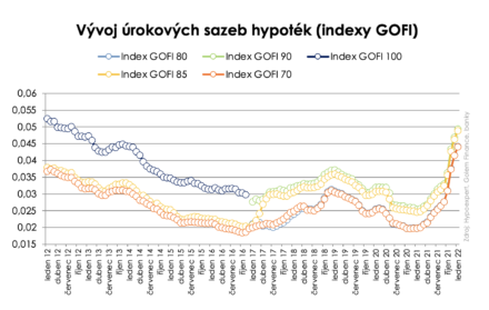 Index GOFI 70, jak už z názvu vyplývá, monitoruje napříč celým trhem nabídkové sazby hypotečních úvěrů v pásmu LTV do 70 %. V případě hypoték poskytovaných na více než 80 % hodnoty nemovitosti (LTV nad 80 %) jsou sazby i nadále zhruba o polovinu procentního bodu vyšší. Index GOFI 85 v lednu vzrostl o 25 bps. na 4,89 % a index GOFI 90 aktuálně dosahuje 4,94 %.