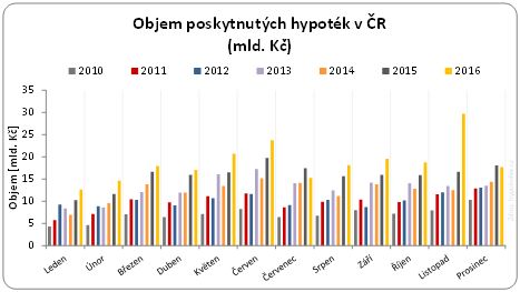V prosinci bylo podle dat serveru hypoindex.cz* poskytnuto 8 684 hypotečních úvěrů (y/y -8,2 %) v celkovém objemu 17,7 mld. Kč, což je o 2,4 procenta méně než v předchozím roce. Průměrná výše hypotéky tedy v prosinci činila 2,034 mil. Kč, což je o 121 000 Kč více než v prosinci 2015. Prosincový objem byl ovlivněn odčerpáním poptávky v předchozím měsíci a menším počtem pracovních dní. Oproti loňskému měsíčnímu průměru byla hodnota sjednaných hypoték o 1,2 mld. Kč nižší.