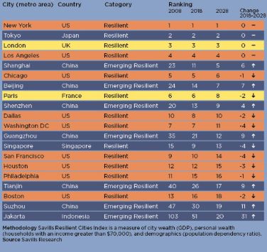 Zatímco žebříček staví New York, Tokyo, Londýn a Los Angeles na top čtyři pozice mezi nejodolnějšími městy, a to s předpokladem až do roku 2028, Savills zároveň upozorňuje na města „pokroková“, jež se výhledově zařadí mezi top 50 metropolí a v příští dekádě budou v žebříčku stoupat nejvýše.