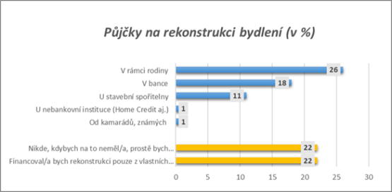 Téměř polovina všech respondentů (44 %) se přitom odmítá kvůli rekonstrukci bydlení jakkoliv zadlužit, proto 22 % lidí raději v současné době nic nerekonstruuje. Jedná se zejména o ženy, seniory a lidi z měst, která mají 20–99 tisíc obyvatel. Zbylých 22 % respondentů provádí rekonstrukce či úpravy svého bydlení pouze z vlastních úspor. Nejvíce dotázaných, kteří provádějí úpravy „na vlastní triko“, je ze severovýchodních Čech, kde tuto odpověď zvolilo celých 39 % respondentů.