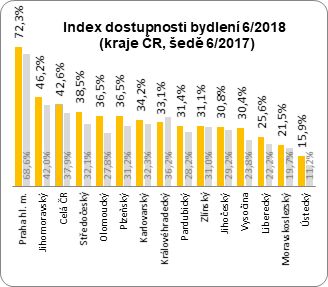 Míra zatížení rozpočtu českých domácností hypoteční splátkou díky tomu meziročně vzrostla o téměř 5 procentních bodů. Měřeno indexem dostupnosti bydlení nyní průměrná česká domácnost vynakládá na splátku hypotéky 43 % svých čistých měsíčních příjmů. Přitom loni v červnu to bylo necelých 38 %, jak ilustruje následující graf. Kromě toho uvádíme také meziroční změnu Indexu dostupnosti bydlení v jednotlivých krajích ČR.