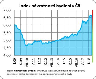 Posun v cenách nemovitostí je ještě markantnější ve vývoji indexu návratnosti bydlení, který nijak nezohledňuje vývoj cen hypoték a poměřuje pouze průměrnou cenu bytů a průměrný čistý roční příjem českých domácností. Zatímco loni v červnu průměrnou českou domácnost vyšel byt v hodnotě 2,56 mil. Kč na zhruba 6násobek čistého ročního příjmu, letos se již hodnota tohoto ukazatele i přes růst příjmové úrovně blíží 7násobku čistých ročních příjmů. Vývoj tohoto poměru mapujeme prostřednictvím Indexu návratnosti bydlení (IDB), jehož vývoj ilustruje následující graf.