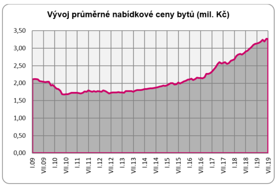 V meziročním srovnání je tempo růstu cen opakovaně stále ještě velmi vysoké, nicméně v meziměsíčním – popřípadě mezikvartálním – srovnání nabídkové ceny již nerostou tak rychle, jako v předchozích obdobích. Průměrná nabídková cena bytů v druhém čtvrtletí 2019 byla 3,23 mil. Kč. Oproti předchozímu roku, kdy byly byty v průměru nabízeny za 2,84 mil. Kč, sice došlo k nárůstu o 14 procent. Ovšem oproti předchozímu čtvrtletí průměrná cena vzrostla jen o 2,5 %. Přitom loni v 1. Q 2018 rostly ceny mezikvartálně o 5 % a ve 2. čtvrtletí o 3 procenta.