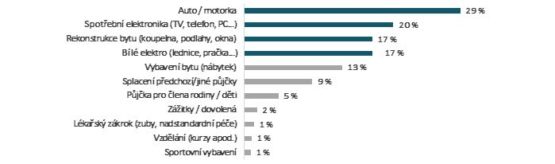 Nejčastěji si bereme úvěr na auta/motorky, spotřební elektroniku (mobily, počítače atd.) a bílé zboží. V polovině případů mají lidé 1 půjčku. Úvěr do výše 100 tisíc Kč přiznává 35 % respondentů, zhruba stejný počet Čechů nechce výši své půjčky sdělit.