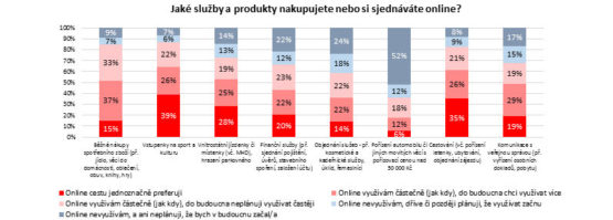 Podle průzkumu Buřinky, Stavební spořitelny České spořitelny, se internet stal pro Čechy běžným prostředkem, jak nakupovat a sjednávat si služby. Nejvíce lidí má s online nákupem zkušenosti v případě pořízení vstupenek na sport nebo na kulturu – ty už si přes internet někdy pořídilo 87 % lidí. Běžné spotřební zboží si už někdy online objednalo 86 % a cestování si zařizovalo 85 % lidí. Zájem a zároveň i potenciál k dalšímu růstu je v oblasti komunikace s veřejnou správou, hromadné dopravy nebo finančních služeb. Naopak nejmenší zájem mají lidé o online nákup dražších movitých věcí.