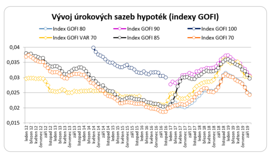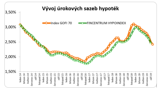 Průměrné nabídkové sazby hypoték v říjnu dál klesaly. Své hypotéky během října zlevnily Money Bank, Wuestenrot, Fio a Air Bank. Index GOFI 70 mapující napříč všemi bankami nabídkovou sazbu hypoték pokrývajících maximálně 70 % hodnoty nemovitosti (70% LTV*) klesl během října o 7 bazických bodů na 2,42 %. Vývoj indexu GOFI ilustruje v následujícím grafu oranžová křivka. Zelená křivka vyjadřuje průměr realizačních sazeb reportovaných serverem hypoindex.cz. Z grafu je patrná korelace obou indexů, přičemž index nabídkových sazeb (GOFI 70) je před indexem realizačních sazeb v měsíčním předstihu.
