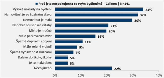 Právě vysoké náklady spojené se současným bydlením vadí více než třetině lidí (34 %). Podobné množství respondentů (32 %) uvedlo, že je trápí špatný stav jejich bytu či domu. Pro 30 % je jejich aktuální obydlí již malé a chtějí se poohlédnout po větším. Jako další argumenty, proč jsou lidé se svým dosavadním bydlením nespokojeni, dotázaní nejčastěji uváděli špatné vztahy se sousedy (21 %), přílišnou hlučnost (20 %), nedostatek parkovacích míst (16 %) či špatné dopravní spojení (11 %). V loňském roce byl největším problémem hluk, výše nákladů tehdy skončila až na pátém místě.