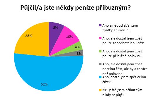 Tři čtvrtiny Čechů někdy půjčili peníze svým příbuzným. Čtvrtina z nich ale půjčku zpátky nikdy nedostala nebo ji nedostala celou. Každý druhý (54 %) se pak snažil o osobní řešení vzniklé situace. Třetina Čechů (27 %) raději peníze oželela a situaci neřešila nijak, aby neohrozila vztahy v rodině. K mimosoudnímu vymáhání pohledávek přistoupilo pouze 5 % dotázaných, ještě méně spor řešilo soudní cestou (4 %). Vyplynulo to z průzkumu Equa bank, který byl realizován v červenci 2017.