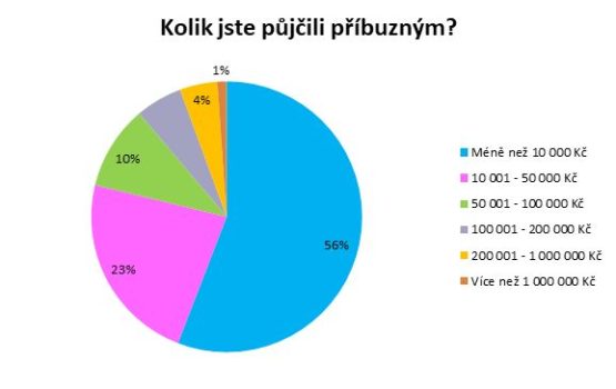 Průzkum ukázal, že nejčastěji půjčili Češi příbuzným částky do 50 tisíc korun (79 %). Každý desátý pak půjčil více než 200 tisíc korun. Průměrná půjčená částka pak činila 90 tisíc korun.