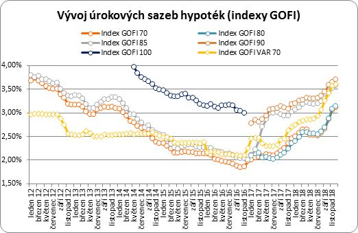 Kromě růstu cen bytů jsme v prosinci zaznamenali další, i když mírnější, nárůst úrokových sazeb. Titulní index GOFI70 mapující vývoj nabídkových sazeb hypoték pokrývajících max. 70 % hodnoty nemovitosti, vzrostl oproti listopadu o 6 setin procentního bodu na 3,11 %. V prosinci 2017 tento typ hypoték nabízely banky v průměru se sazbou 2,45 %, tedy o více než půl procentní bod nižší.