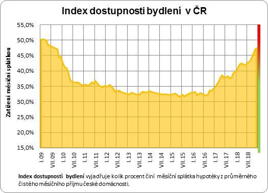 V důsledku růstu cen i zdražování hypoték dochází k dalšímu zhoršování dostupnosti vlastnického bydlení. Zatímco v roce 2017 při průměrné nabídkové ceně 2,66 mil. Kč a hypoteční sazbě 2,44 % vynaložila průměrná česká domácnost na splátku hypotéky 39,7 % svých čistých příjmů, v závěru loňského roku to bylo při ceně 3,12 mil. Kč a sazbě 3,10 % již 47,5 %.