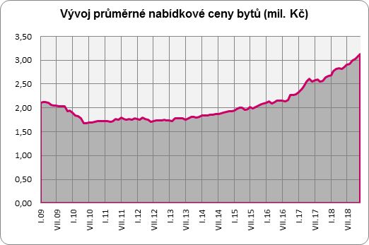 Podle aktuálních dat portálu RealityČechy.cz vzrostla v prosinci 2018 průměrná nabídková cena bytů o dalších 30 000 Kč na 3,12 mil. Kč. V porovnání s prosincem 2017, kdy se průměrná cena pohybovala na 2,66 mil. Kč, podražily byty v průměru o 460 000 Kč. Dosavadní vývoj cen ilustruje následující graf.