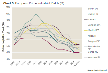 Množství investic v posledních letech vedlo ke kompresi výnosů na větších trzích. Společnost Savills zaznamenala, že průměrná výnosnost prvotřídních průmyslových nemovitostí v Evropě během prvního pololetí roku 2019 klesla o 20 bazických bodů, z 4,9 % na 4,7 %. K výrazné kompresi výnosů došlo v Praze (-150 bazických bodů), Stockholmu (-30 bazických bodů) a Madridu (-25 bazických bodů).
