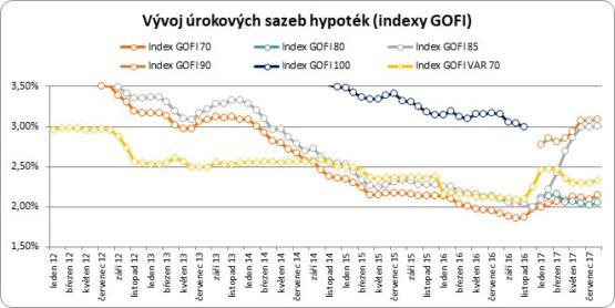 Průměr nabídkových sazeb roste. A to i úvěrů do 80 % LTV, které nejsou ovlivněny regulací ČNB a jejichž sazby dosud spíše stagnovaly nebo dokonce mírně klesaly. Index GOFI 70 mapující napříč všemi bankami vývoj nabídkových sazeb hypoték s LTV do 70 % v srpnu stoupl z červencových 2,09 % na 2,14 %. A stejným směrem se vydal i index GOFI 80, jehož hodnota meziměsíčně vzrostla z 2,01 na 2,05 %. Oproti loňskému roku, kdy už sazby mířily ke svému historickému dnu (dosáhly na něj v říjnu 2016), je nyní index GOFI 70 o 22 bazických bodů výše.