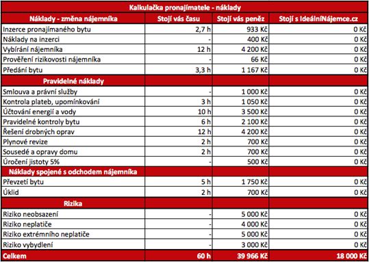 Často podceňované jsou právě drobné náklady, které ale za rok tvoří poměrně velké částky. V případě, že v kalkulačce majitel uvede výši nájmu 10 000 korun a svůj čas ocení například 350 korunami (průměr zadávaných částek v Brně), měl by počítat s tím, že ho bude pronajímání na vlastní pěst stát ročně o 60 hodin a 21 966 korun více. Se službou IdeálníNájemce.cz tuto částku i čas strávený pronajímáním ušetří.