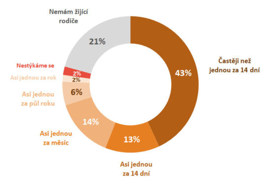 Rodinné vztahy v Česku jsou pevné a být s rodiči v pravidelném kontaktu je pro většinu z nás samozřejmostí. To ukázal průzkum NMS Market Research pro Raiffeisen stavební spořitelnu. Jednou za dva týdny nebo častěji se s rodiči vídá 56 % dotázaných, naproti tomu pouze minimum lidí své rodiče nenavštěvuje vůbec.