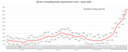 Výsledky Broker Consulting Indexu hypotečních úvěrů deklarují, že nárůst úrokových sazeb v srpnu nadále nepolevil. Naopak průměrné sazby u hypoték meziměsíčně stouply o 0,21 procentního bodu, oproti červenci se tak v srpnu tento typ úvěru na bydlení poskytoval za 5,82 %. Nejvíce preferované jsou z dlouhodobého hlediska u hypoték stále pětileté fixace sazeb. Podle předstihového ukazatele se v září předpokládá poskytování hypoték s pětiletou fixací v blízkosti úrokové sazby 6,17 %.
